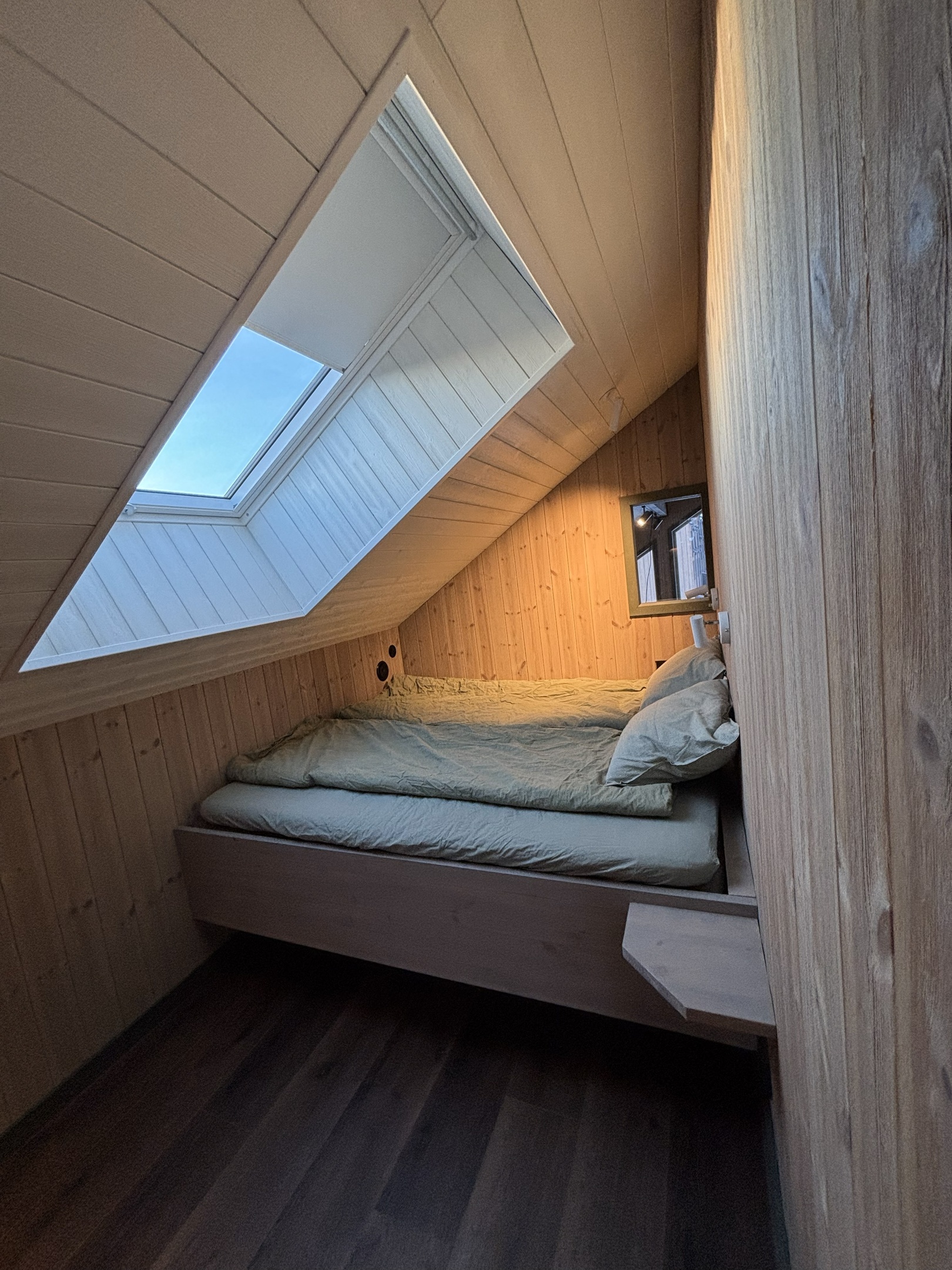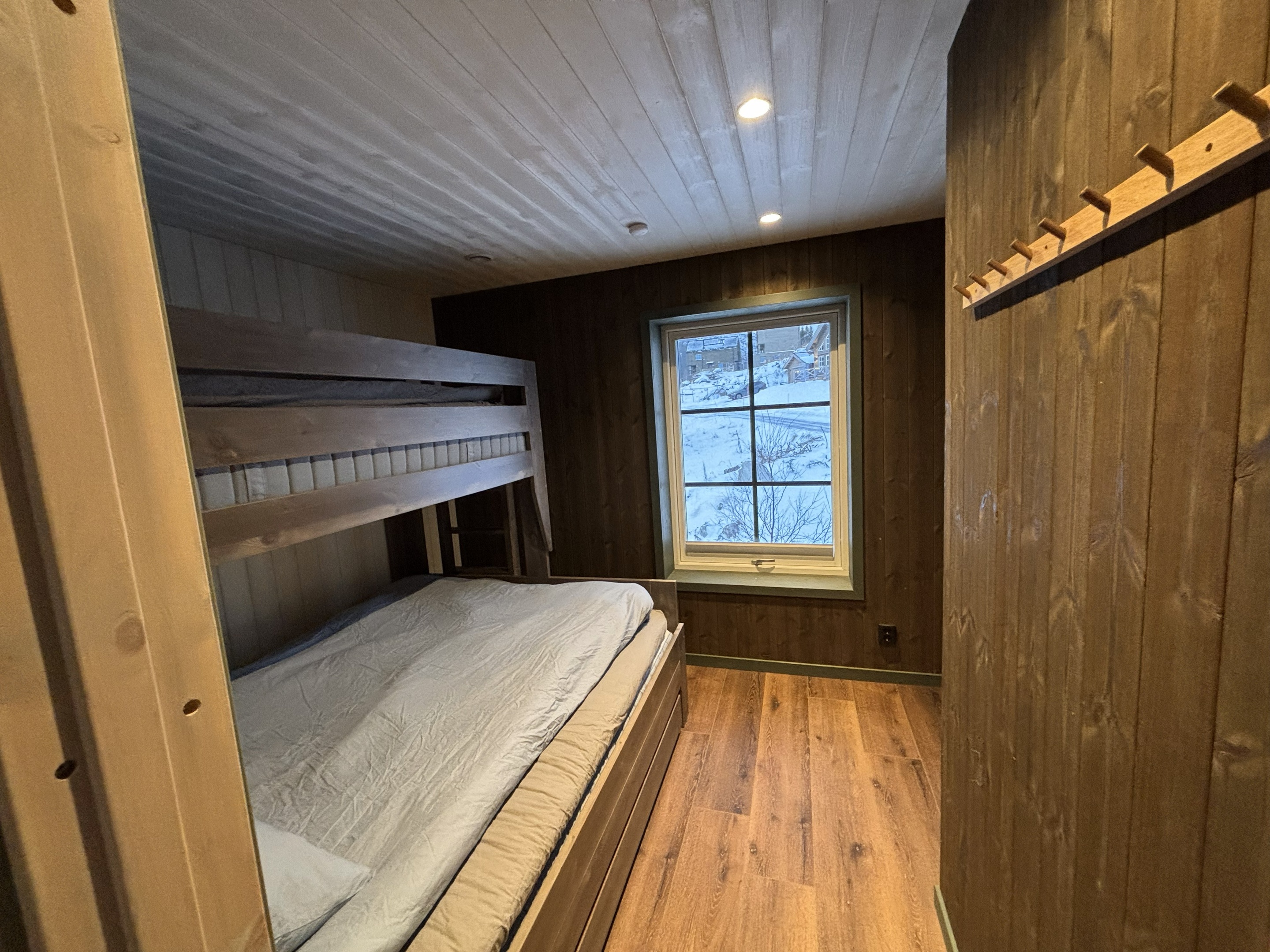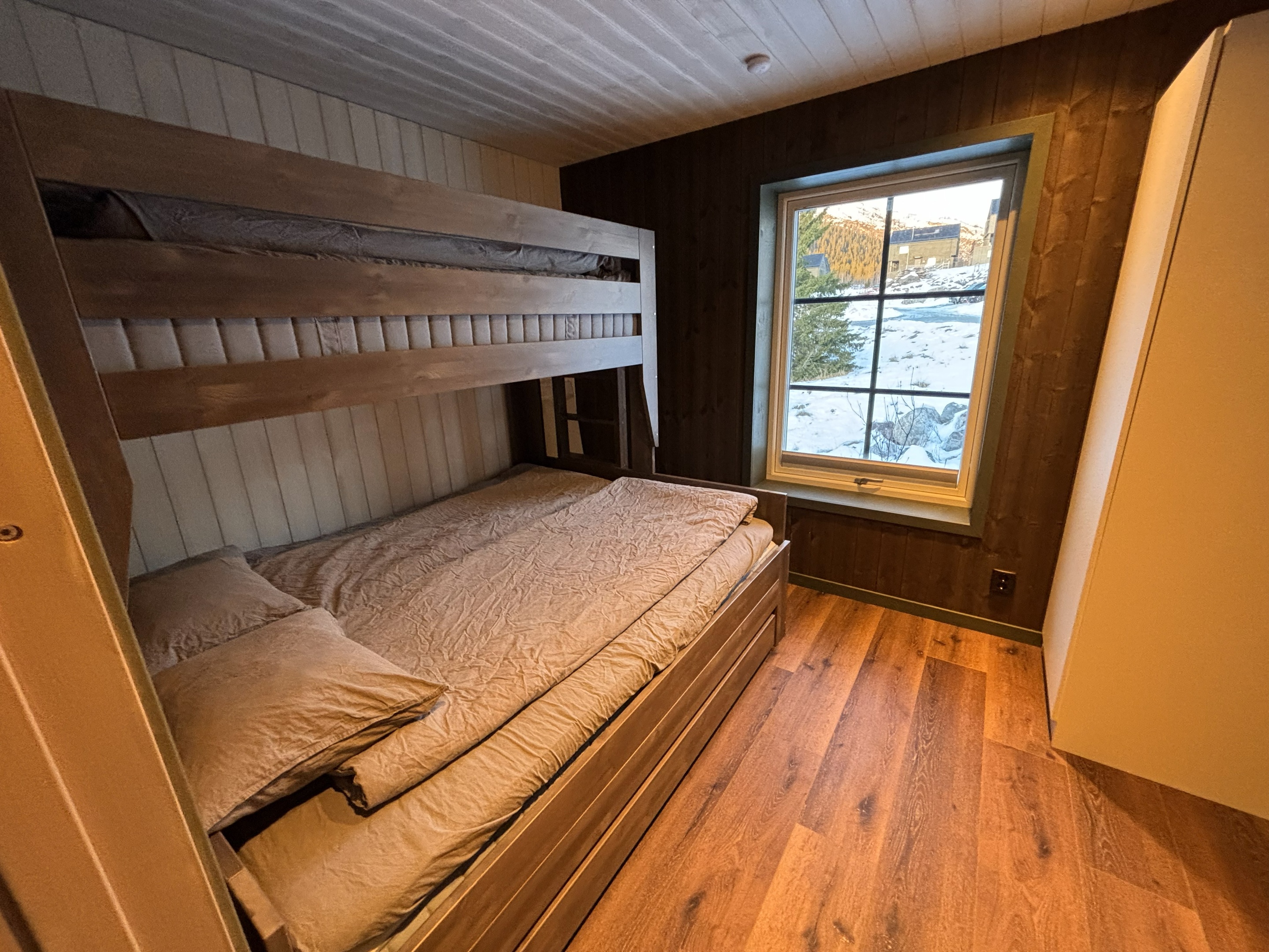 2 sovrum med våningssäng, där nedre bädden är en dubbelsäng och övre bädden en enkelsäng
